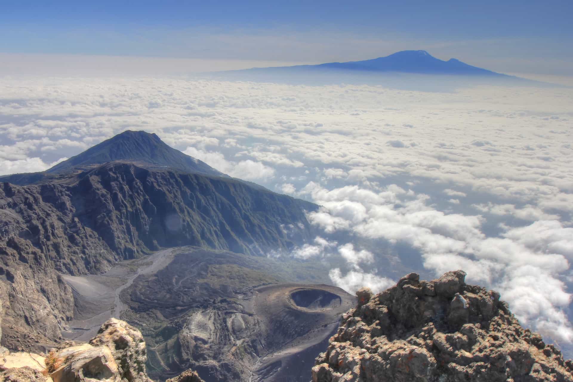 Higher up, bamboo forests create a mysterious and enchanting atmosphere, with towering stalks forming natural tunnels along the trail. Beyond this, the landscape opens into moorland and alpine zones, where vegetation becomes sparse and hardy plants such as giant lobelias and groundsels dominate the terrain. From these higher elevations, hikers are rewarded with breathtaking views of volcanic craters, waterfalls, and Tanzania’s vast plains. On clear days, the snow-capped peak of Mount Kilimanjaro, the Ngorongoro Crater, and the Great Rift Valley can be seen stretching into the distance.